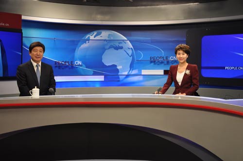 圖為中國(guó)人民健康保險(xiǎn)股份有限公司黨委書記、總裁宋福興與人民網(wǎng)主持人合影