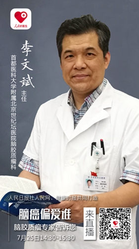 7月25日(周二)下午2:30-3:30,首都醫(yī)科大學(xué)附屬北京世紀(jì)壇醫(yī)院腦膠質(zhì)瘤科主任李文斌教授將在“人民好醫(yī)生”客戶端,科普問(wèn)診直播中揭開(kāi)腦膠質(zhì)瘤的層層真相,并回答廣大網(wǎng)友的提問(wèn)!