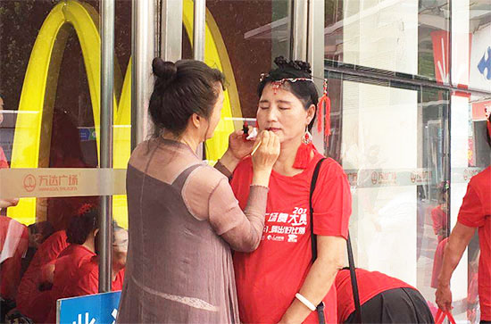 一大早,報(bào)名北京石景山賽區(qū)的大爺大媽們就聚攏一處,換上大賽指定服飾,或挽發(fā),或描眉,或切搓舞藝,或合影留念,帶著他們的精氣神兒準(zhǔn)備一展風(fēng)采。