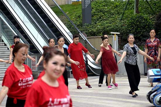 圍觀的阿姨們也跟隨著正在練習(xí)的舞隊(duì)們跳起了《1:1:1舞出好比例》