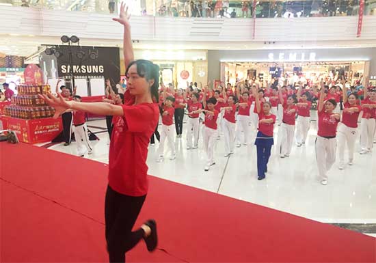 活動(dòng)現(xiàn)場,一支手持健身球的舞隊(duì),在歡快的節(jié)奏帶動(dòng)下,手中的健身球上下飛舞,有節(jié)奏的擊打著參賽者身上的各個(gè)穴位。