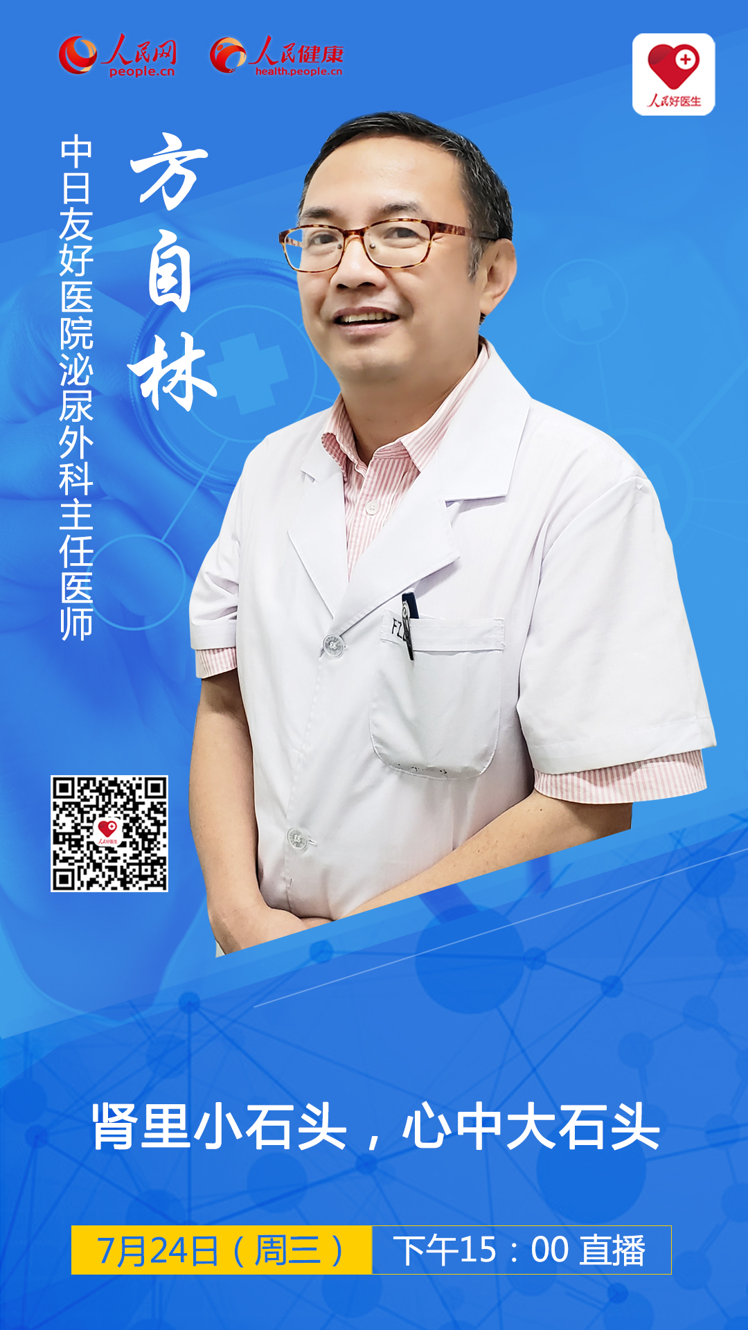 2019年7月24日(周三)下午15:00,“人民好醫(yī)生”客戶端將邀請中日友好醫(yī)院泌尿外科主任醫(yī)師方自林進(jìn)行視頻和圖文直播,詳細(xì)講解腎結(jié)石形成的原因、癥狀及治療。并在線解答廣大網(wǎng)友相關(guān)問題,千萬不要錯過!