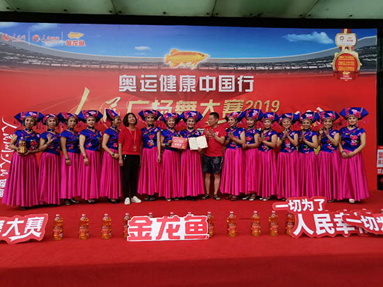 在決賽結(jié)束之時(shí),大媽們自發(fā)地用扇子拼出了”2019金龍魚 1:1:1”“人民網(wǎng)”的字樣,用他們的熱情表達(dá)了對此次活動(dòng)的熱愛和支持。領(lǐng)隊(duì)李阿姨說,”平日里,有的隊(duì)員要上班,有的要忙家務(wù),只有晚上才能集中一起排練,大家都很辛苦。排練時(shí)因?yàn)閯?dòng)作問題,有時(shí)候我們還會(huì)發(fā)生一些爭執(zhí)。但今天演出時(shí)我們都一條心,以最好的狀態(tài)完成舞蹈,大家都非常高興!也感謝人民網(wǎng)和金龍魚給了我們這個(gè)舞臺(tái)展現(xiàn)我們的成果!”