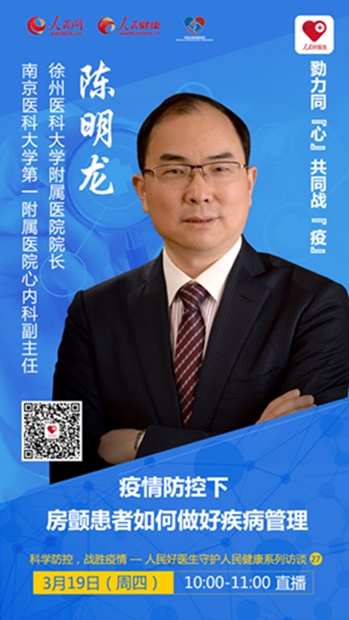 2020年3月19日(周四) 10:00-11:00,“人民好醫(yī)生”客戶端將邀請(qǐng)徐州醫(yī)科大學(xué)附屬醫(yī)院院長(zhǎng)、南京醫(yī)科大學(xué)第一附屬醫(yī)院心內(nèi)科副主任陳明龍進(jìn)行視頻直播,與您分享疫情防控期間,房顫患者該如何做好疾病管理。