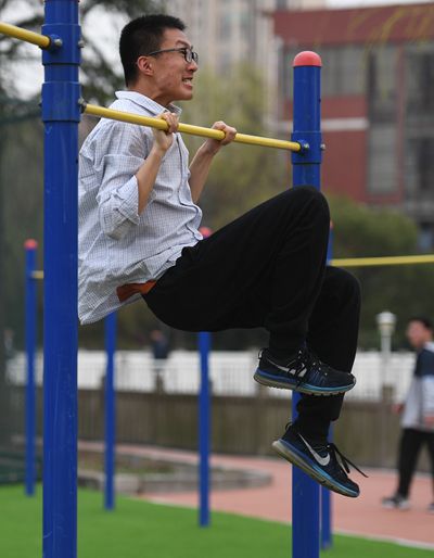 3月10日,在江蘇省錫山高級(jí)中學(xué),學(xué)生在做引體向上。 新華社記者 季春鵬/攝