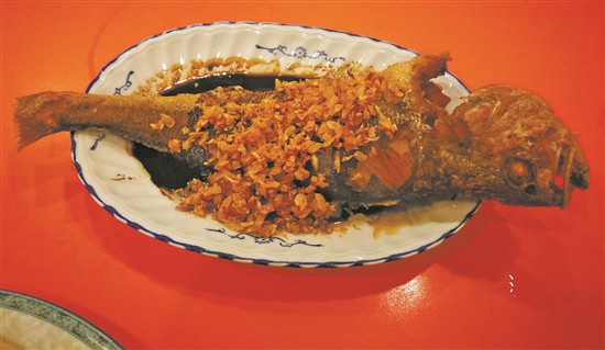 豉油糖炸黃花魚是雅苑的招牌菜,幾乎每桌必點,外皮酥脆、內(nèi)里細(xì)嫩,碟底的醬油以及鋪滿魚身的炸蒜粒都令其風(fēng)味更為獨特。