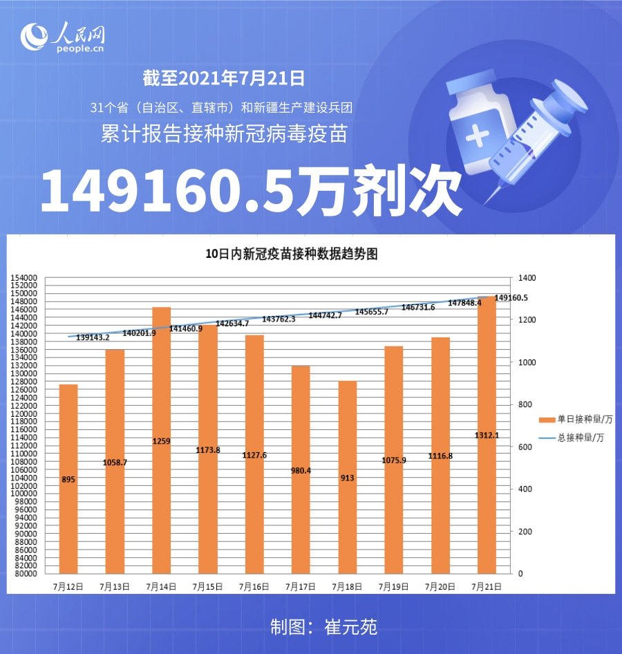 人民網(wǎng)北京7月22日電 (記者崔元苑)據(jù)國家衛(wèi)生健康委官網(wǎng)消息,截至2021年7月21日,31個。ㄗ灾螀^(qū)、直轄市)和新疆生產(chǎn)建設(shè)兵團累計報告接種新冠病毒疫苗149160.5萬劑次。