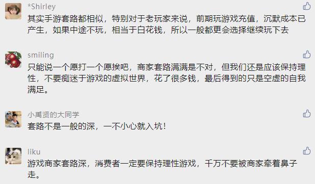 上海市消保委表示,事實(shí)上所有的手游都在竭盡全力營造代入感,通過強(qiáng)烈的代入感可以使玩家將游戲體驗(yàn)誤做人生體驗(yàn),逐漸模糊游戲與現(xiàn)實(shí)的邊際,再通過人性在游戲中代入的舒適感、成長感、成就感、失敗感這四感形成消費(fèi)閉環(huán),并利用這些人性的弱點(diǎn)來謀利,這就是為什么這些套路能屢屢成功的原因。