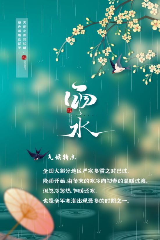 江蘇省農(nóng)業(yè)科學(xué)院研究員陳新、南京信息工程大學(xué)應(yīng)用氣象學(xué)院副教授江曉東介紹,雨水節(jié)氣時(shí),太陽直射點(diǎn)由南半球向赤道靠近。此時(shí)全國氣候總體趨勢(shì)是由冬末的寒冷向初春的溫暖過渡。全國大部分地區(qū)多雪之時(shí)已過,降雨開始,氣溫回升,但降雨仍以毛毛細(xì)雨為主。