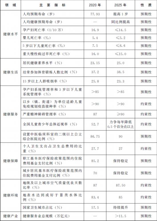 。ㄈ┌l(fā)展目標。到2025年,衛(wèi)生健康體系更加完善,中國特色基本醫(yī)療衛(wèi)生制度逐步健全,重大疫情和突發(fā)公共衛(wèi)生事件防控應對能力顯著提升,中醫(yī)藥獨特優(yōu)勢進一步發(fā)揮,健康科技創(chuàng)新能力明顯增強,人均預期壽命在2020年基礎上繼續(xù)提高1歲左右,人均健康預期壽命同比例提高。