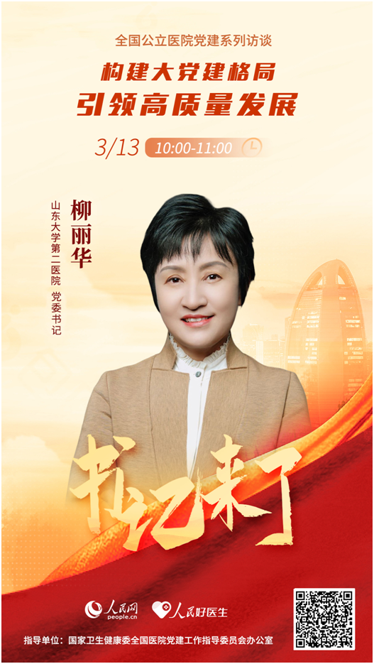 加強(qiáng)學(xué)科建設(shè),提升患者就醫(yī)滿意度是公立醫(yī)院高質(zhì)量發(fā)展的一個重要維度。如何通過高質(zhì)量黨建引領(lǐng)醫(yī)院學(xué)科建設(shè),滿足患者的疾病臨床需求,提升診療能力和服務(wù)水平?3月13日10:00,山東大學(xué)第二醫(yī)院黨委書記柳麗華將做客《書記來了》,與大家分享醫(yī)院在加強(qiáng)黨建、改善人民群眾就醫(yī)體驗等方面的經(jīng)驗和做法,敬請關(guān)注。