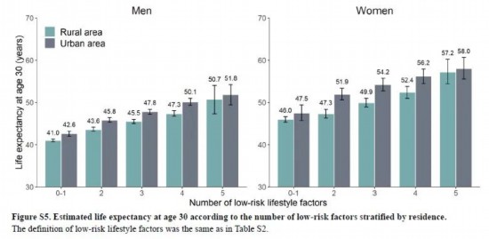 研究結(jié)果表明,在中國人群中,與具備0-1項(xiàng)低風(fēng)險(xiǎn)生活方式者相比,同時(shí)具備上述5項(xiàng)健康生活方式者的男、女性人群30歲時(shí)的期望壽命分別長8.8和8.1歲(圖1)。死因分解分析表明,女性中延長的期望壽命有72%可歸因于心血管疾病、癌癥和慢性呼吸系統(tǒng)疾病死亡率的降低,男性中歸因比例為64%。