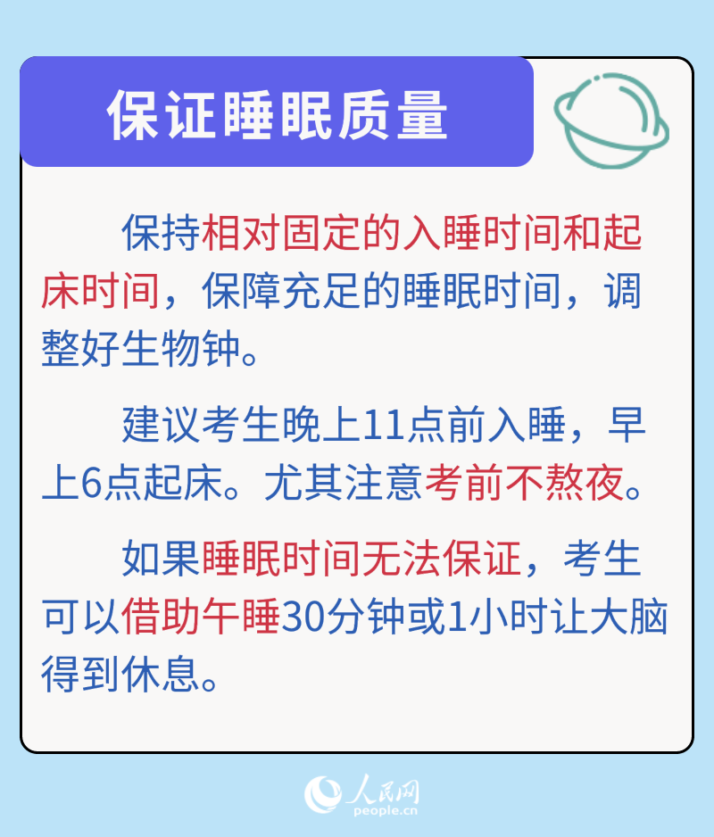2024年全國(guó)高考即將開始,很多考生也已進(jìn)入最后“沖刺”階段。對(duì)于考生來(lái)說(shuō),充足的睡眠是考試成功的關(guān)鍵,不僅能讓考生精力充沛,還能提高記憶力、增強(qiáng)復(fù)習(xí)效果?记叭绾伪WC優(yōu)質(zhì)睡眠?為此,人民網(wǎng)采訪了清華大學(xué)第一附屬醫(yī)院全科醫(yī)學(xué)科主任醫(yī)師姜岳。