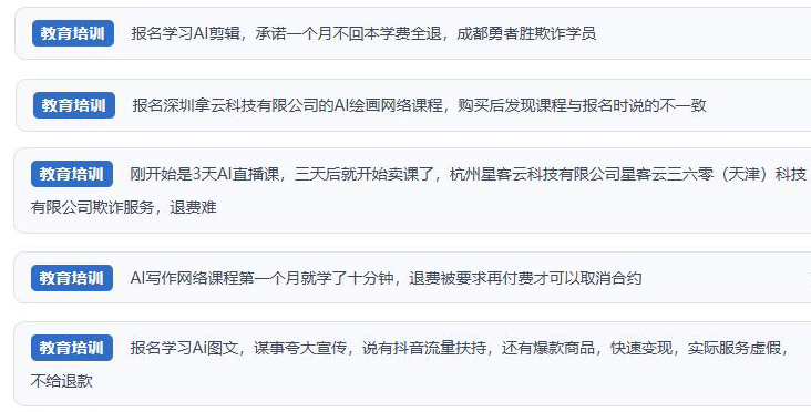 然而,“人民投訴”經(jīng)梳理發(fā)現(xiàn),網(wǎng)絡(luò)上不少消費(fèi)者吐槽相關(guān)課程質(zhì)量良莠不齊,與廣告承諾“免費(fèi)領(lǐng)取AI應(yīng)用體驗(yàn)課及AI工具”“低投入、高回報(bào)”“副業(yè)賺錢”“快速變現(xiàn)”等內(nèi)容大相徑庭。相關(guān)商家虛假宣傳、誘導(dǎo)消費(fèi)、貨不對(duì)板以及退費(fèi)難等問(wèn)題被反復(fù)提及。