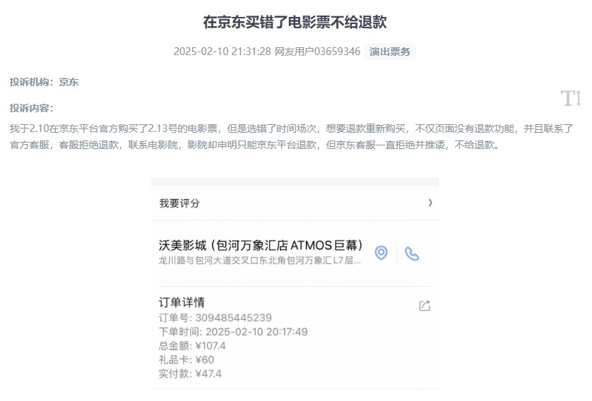 “我于2月10日在京東平臺購買的2月13日電影票,因選錯了時間場次,想要退款重新購買,不僅頁面沒有退款功能,官方客服也拒絕退款,聯(lián)系電影院,影院卻聲明只能在平臺退款。”這是人民網(wǎng)“人民投訴”平臺用戶近日遇到的煩心事。