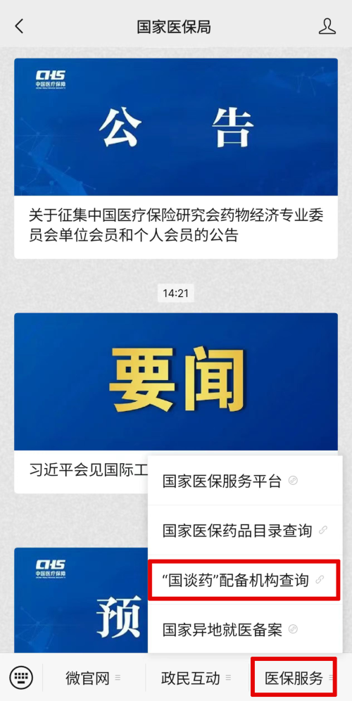 第一步:進入“國家醫(yī)保局”微信公眾號,點擊醫(yī)保服務→“國談藥”配備機構查詢,進入查詢頁面。