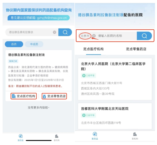 第三步:點擊“定點醫(yī)療機構”或“定點零售藥店”,即可查詢該藥品在各地區(qū)的配備情況。