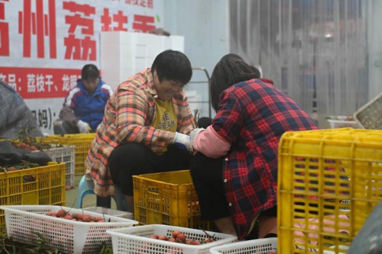 6月18日,果農(nóng)在廣東茂名高州的一個冷庫中打包荔枝。新華社記者 肖恩楠 攝
