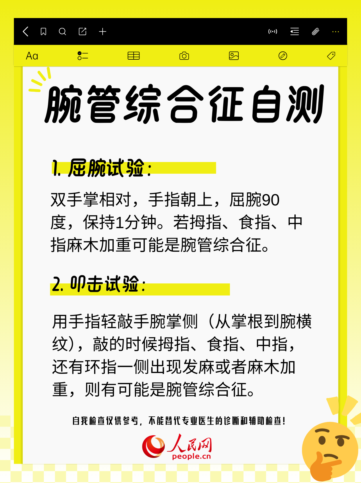 宋德恩提醒說,自測方法僅供參考,實(shí)際生活中這兩種疾病可能同時存在,癥狀也可能與其他疾病,例如糖尿病周圍神經(jīng)病變、肘管綜合征、胸廓出口綜合征等混淆?!叭羰致?、疼痛持續(xù)超過1周,或出現(xiàn)肌肉無力、拿東西不穩(wěn),別硬扛,及時去手外科或顯微外科就診?!彼蔚露骱粲?,早發(fā)現(xiàn)、早調(diào)整、早治療,能減少很多麻煩。