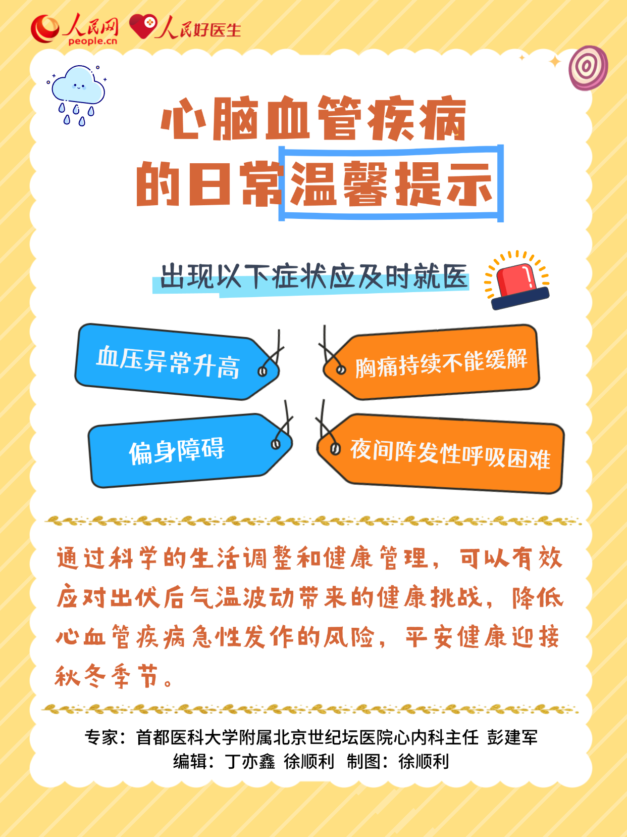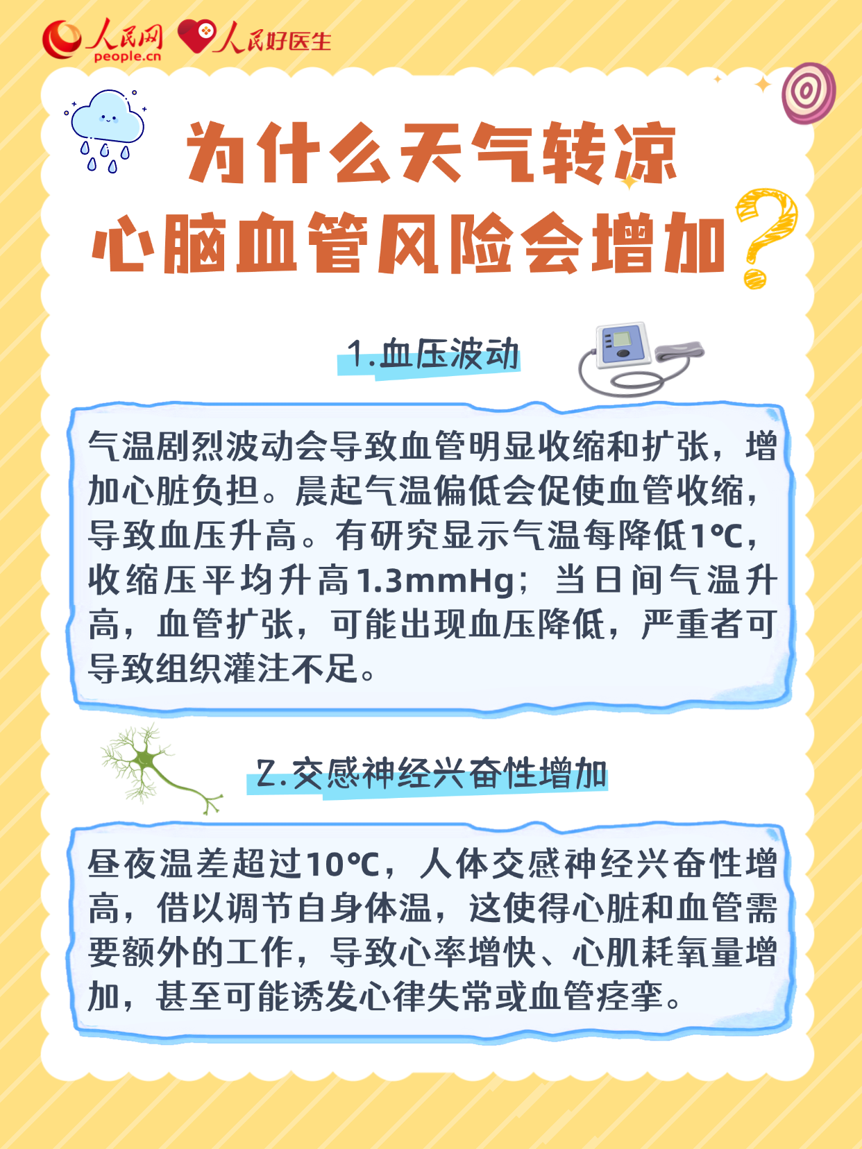 眼下正值夏秋季節(jié)更替,尤其處暑后秋意明顯,晝夜溫差逐漸變大。其實(shí),血管最怕“一冷一熱”的刺激,在這個(gè)時(shí)節(jié),高血壓、心梗、中風(fēng)風(fēng)險(xiǎn)顯著上升。對(duì)于心腦血管疾病,有哪些預(yù)防措施?出現(xiàn)哪些情況要及時(shí)就醫(yī)?