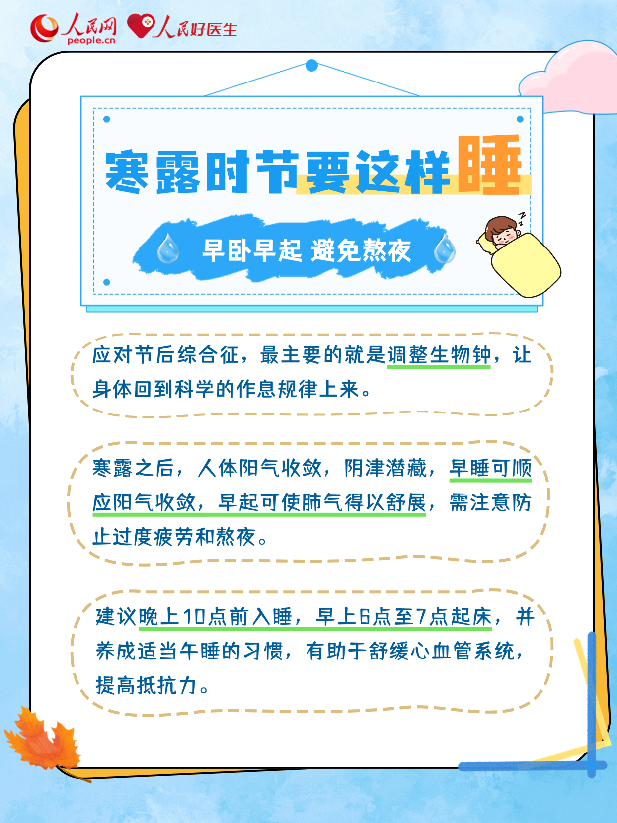 寒露如約而至,標志著深秋的到來,氣溫持續(xù)下降,晝夜溫差增大,自然界中的陽氣漸收,陰氣漸盛。多數(shù)人因假日期間,睡眠及飲食規(guī)律被打亂,常表現(xiàn)出周身困乏、腸胃不適甚至惡心、陣發(fā)性眩暈、焦慮、睡眠差等癥狀。寒露時節(jié)養(yǎng)生應注意哪些要點?