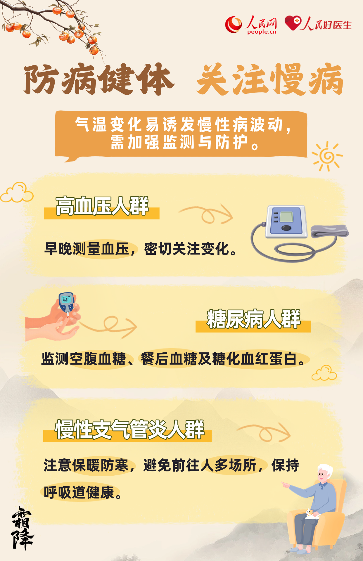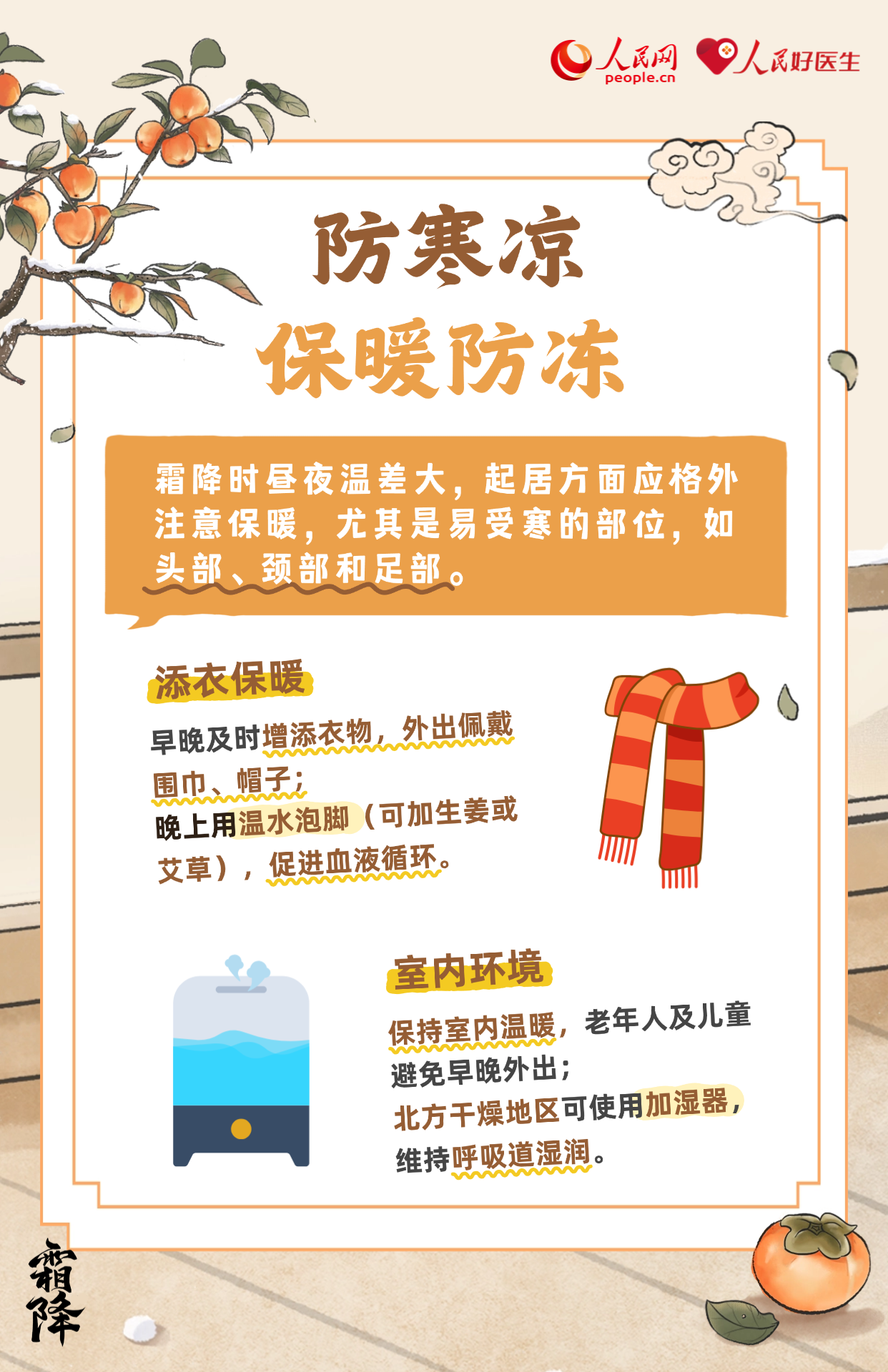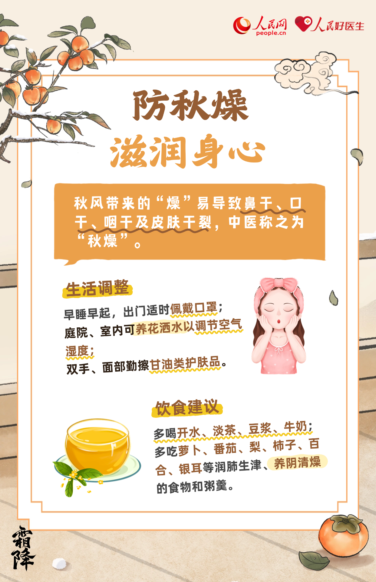 霜降,是二十四節(jié)氣中的第十八個(gè)節(jié)氣,也是秋季最后一個(gè)節(jié)氣。氣溫驟降、晝夜溫差大。養(yǎng)生當(dāng)以“防寒潤燥,滋陰溫陽”為重點(diǎn),此時(shí)節(jié)要做好養(yǎng)生保健,無論起居養(yǎng)生還是運(yùn)動(dòng)調(diào)養(yǎng)都應(yīng)謹(jǐn)慎,湖北省中醫(yī)院治未病中心主任醫(yī)師楊帆為大家?guī)砩钋镳B(yǎng)生攻略。